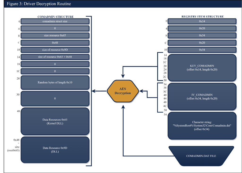 Upon execution, Snake’s WerFault.exe will attempt to decrypt an encrypted blob within the Windows registry that is typically found at HKLM:\SOFTWARE\Classes\.wav\OpenWithProgIds. The encrypted data includes the AES key, IV, and path that is used to find and decrypt the file containing Snake’s kernel driver and kernel driver loader. The registry object’s structure can be seen on the right side of the following figure. Snake uses Microsoft Windows Cryptography API: Next Generation (CNG) key store to store the AES key needed to decrypt the registry object.