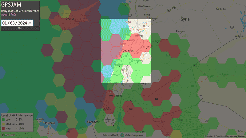 While Israel has reportedly aggressively jammed its adversaries in the region since the outbreak of the most recent conflict in October, the website GPSJam.org, which maps purported GNSS interference based on publicly broadcasted aircraft data, appears to show an geographical increase in interference over Lebanon in recent weeks. As of publication there appears to be interference covering most of the southern half of the country.