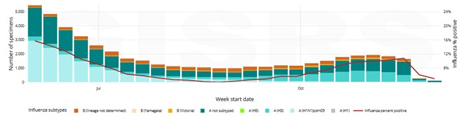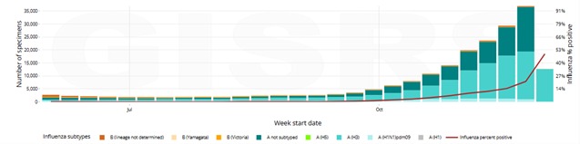 Influenza activity was variable between countries, with those in the west of the Region generally seeing earlier increases of influenza indicators compared to others. Influenza admissions, detections, and percent positivity in hospital surveillance were also increasing from inter-seasonal levels, with a higher proportion aged 65 years or older. A majority of influenza detections from sentinel and non-sentinel primary care and hospital surveillance systems were A(H3N2) viruses.
