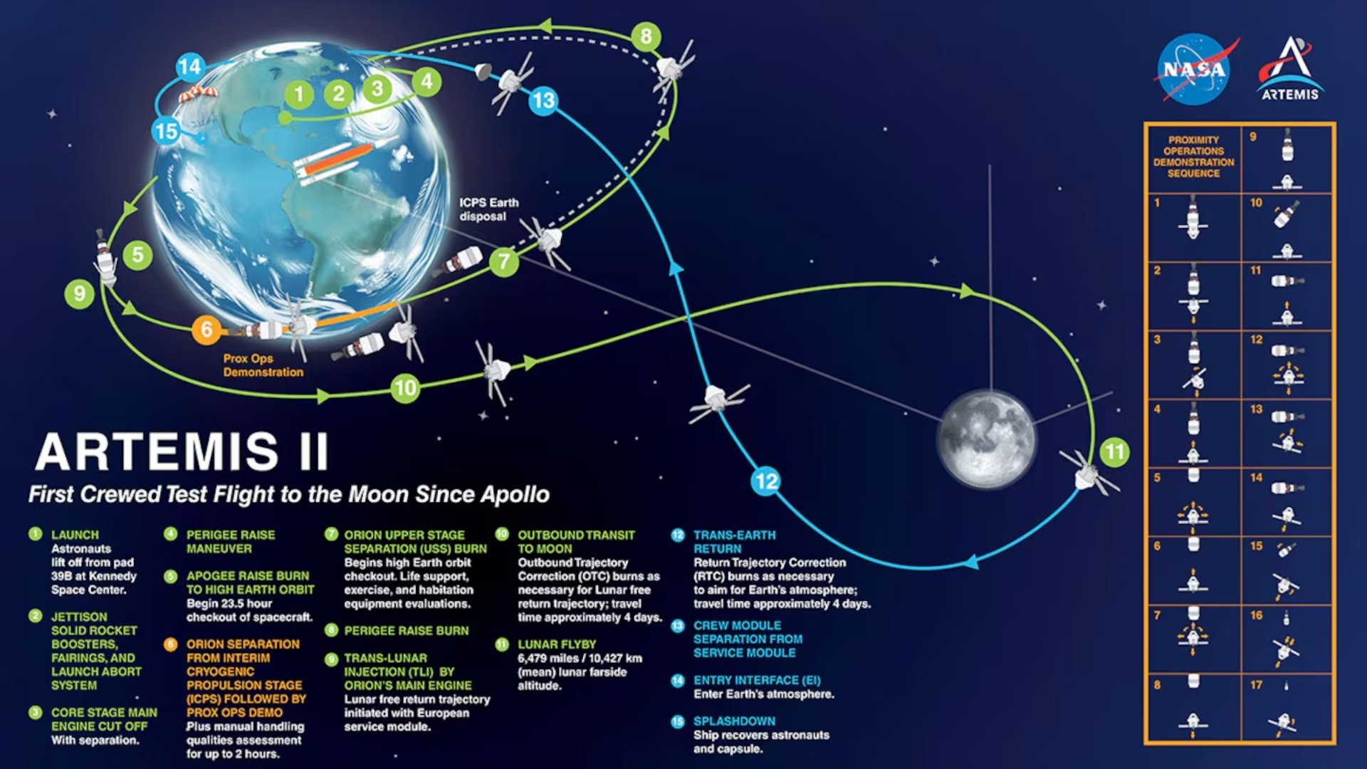 Cuatro astronautas se aventurarán alrededor de la Luna en Artemis II, la primera misión tripulada de la NASA para establecer una presencia a largo plazo en el satélite. El vuelo de 10 días ayudará a confirmar y evaluar los sistemas y el hardware necesarios para las primeras misiones humanas de exploración lunar. Artemis II se debe al éxito del Artemis I no tripulado de 2022 y demostrará una amplia gama de capacidades necesarias en misiones al espacio profundo. El vuelo de prueba Artemis II será la primera misión de la NASA con tripulación a bordo del cohete SLS (Sistema de Lanzamiento Espacial) y la nave Orion. La misión Artemis II llevará a los astronautas más lejos de la Tierra y más cerca de la Luna que cualquier humano ha estado en más de medio siglo. Desde este punto de vista y entorno únicos, la tripulación de Artemis II trabajará con científicos en la Tierra para facilitar investigaciones científicas que informen futuras misiones espaciales tripuladas.