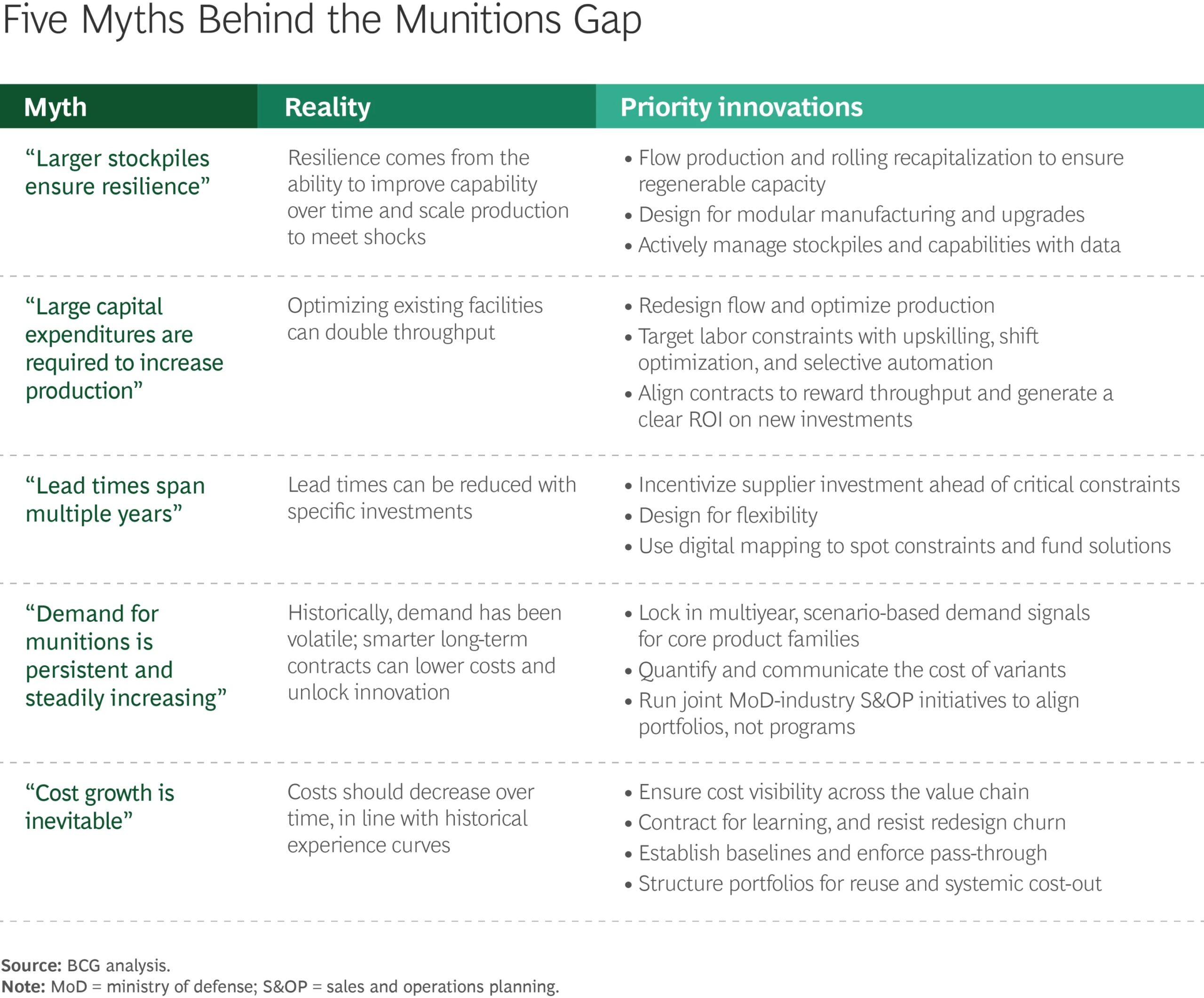 Fundamental changes are essential to meet the requirements of ministries of defense (MoDs). Governments and industry must build a sustainable operating system to improve production rates for key munitions. Our report addresses five common myths related to munitions and offers practical steps that will enable MoDs and industry to innovate more effectively and increase munitions production capacity. (See the exhibit.)