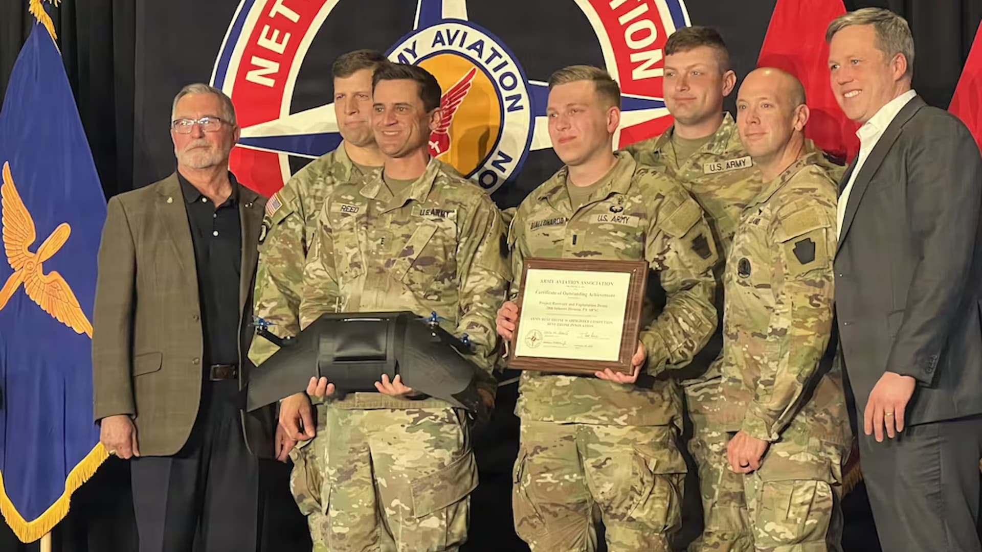Premio a la mejor innovación en la primera competencia de mejor combatiente con drones del US Army en Huntsville, Alabama. Personal de la 28 División de Infantería de la Guardia Nacional del Ejército ha ganado un premio por inventar un dron que utiliza un mecanismo similar a una máquina de garra arcade para recuperar drones derribados. El nuevo dron del Proyecto RED puede recuperar un dron amigo para repararlo o capturar un dron enemigo para explotar la información obtenida.