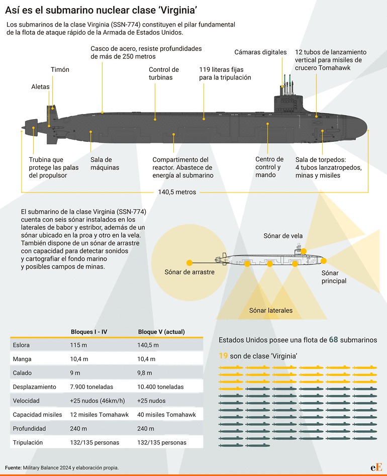 Los submarinos nucleares de la clase Virginia llevan más de 20 años en servicio en la Armada de EEUU. Estos buques, que cuentan con lanzamisiles de crucero y cuatro tubos lanzatorpedos, constituyen la columna vertebral de los submarinos de ataques del país norteamericano junto con la clase Los Ángeles desarrollada durante la Guerra Fría.