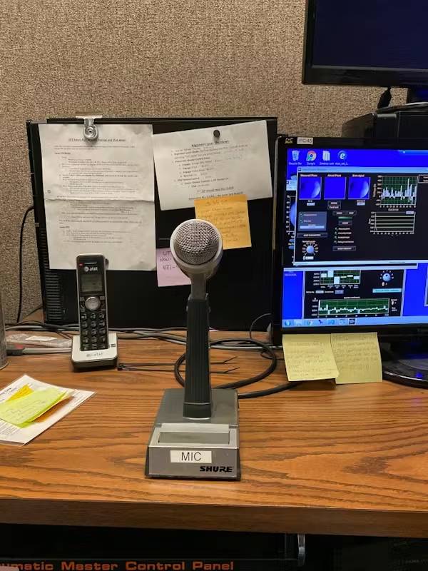 I lean into the microphone at the control desk, a vintage piece that looks like it belongs in a World War II radio room, and announce that we’re going into a system shot. Then I open the compressor beam dump: a heavy glass plate that normally blocks the beam from reaching the target. It takes about two minutes to move.