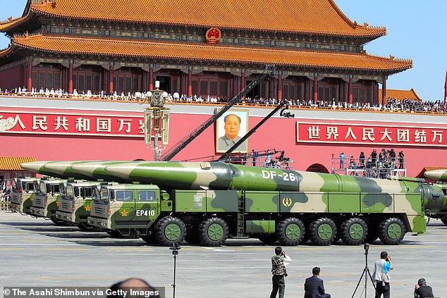 DF-26 made its first public appearance in September 2015 during a military parade in Beijing to mark the 70th anniversary of the end of World War II (pictured). It was also flaunted on October 1 last year during a parade to mark the 70th anniversary of the founding of China
