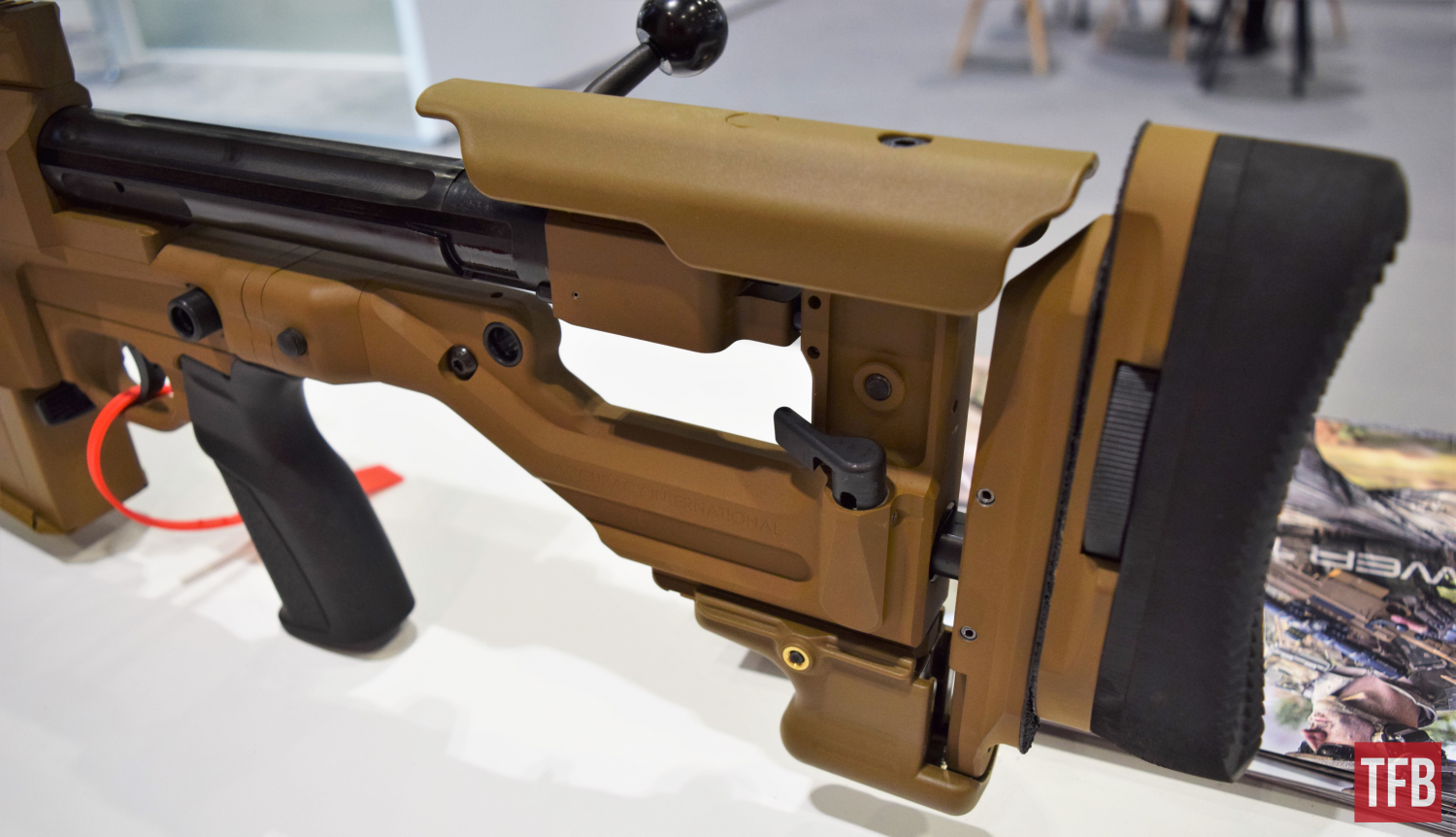 The improved AX50 ELR was also on display with its new spring-loaded butt and now compatibility with using AR-15 pattern pistol grips of the user’s choice. The rifle now has the 3 position bolt mounted shroud safety seen on other AI rifles. Like the AX MKIII, the rifle comes as standard with a two-stage trigger with a weight between 3.3 and 4.4lbs. The AX50 ELR has a new 10 round magazine, which has the same dimensions regardless of caliber – .408 CheyTac and .375 CheyTac are also now available options. AI noted that this exact model is currently in service with an undisclosed European military.
